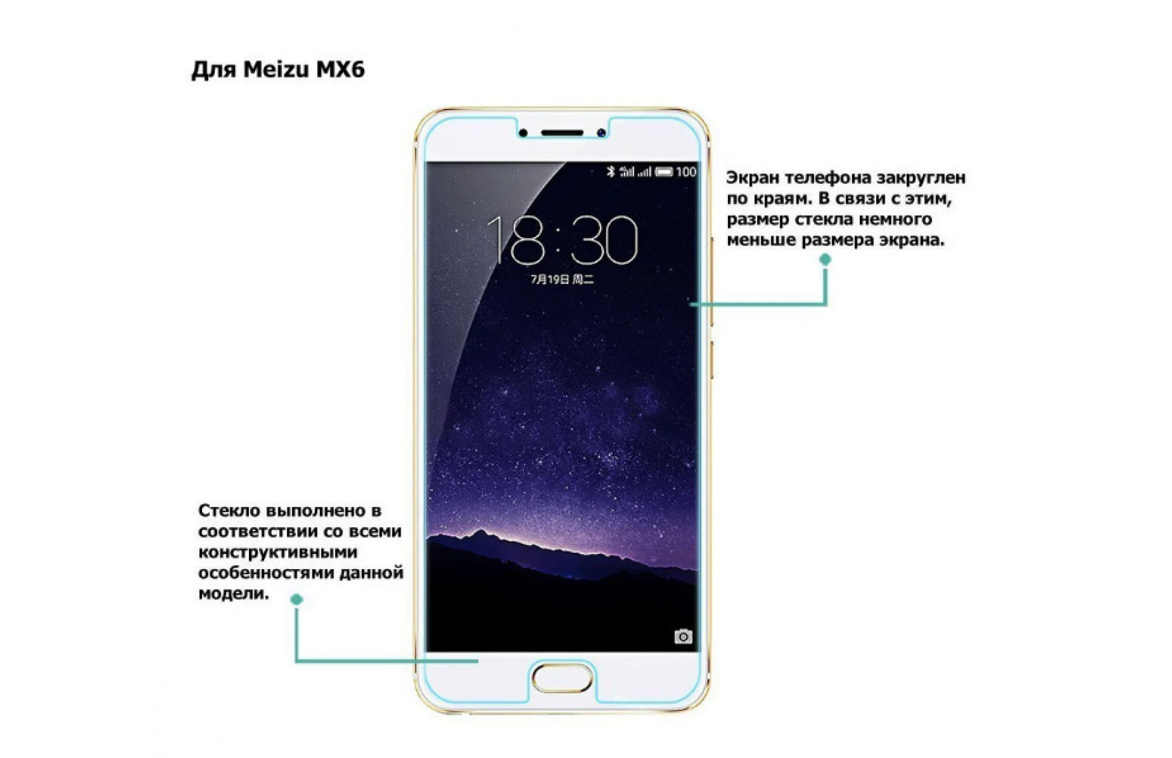 Стекло защиты (именно стекло, НЕ пленка!) для телефона MEIZU MX6 в комплекте с салфетками (сухая и влажная) для протирки экрана перед наклеиванием.